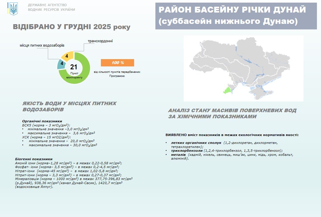 За результатами лабораторних досліджень у грудні поточного року у питних пунктах спостереження суббасейну нижнього Дунаю (р. Дунай, 48 км та 20 км, канал Дунай-Сасик, водосховище Ялпуг) відмічається перевищення гранично допустимої концентрації (ГДК) по показнику хімічне споживання кисню (ХСК) у всіх пунктах; мінералізація, БСК5, ортофосфати – у водосховищі Ялпуг; марганець – у пунктах спостереження р. Дунай (48 км), канал Дунай-Сасик та водосховище Ялпуг.