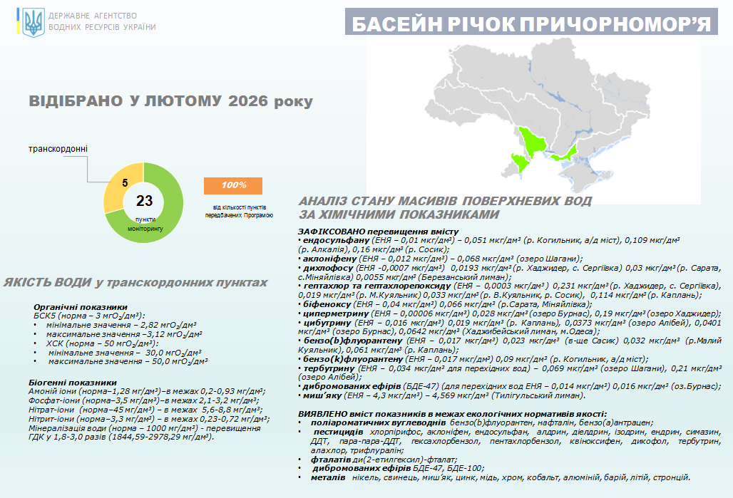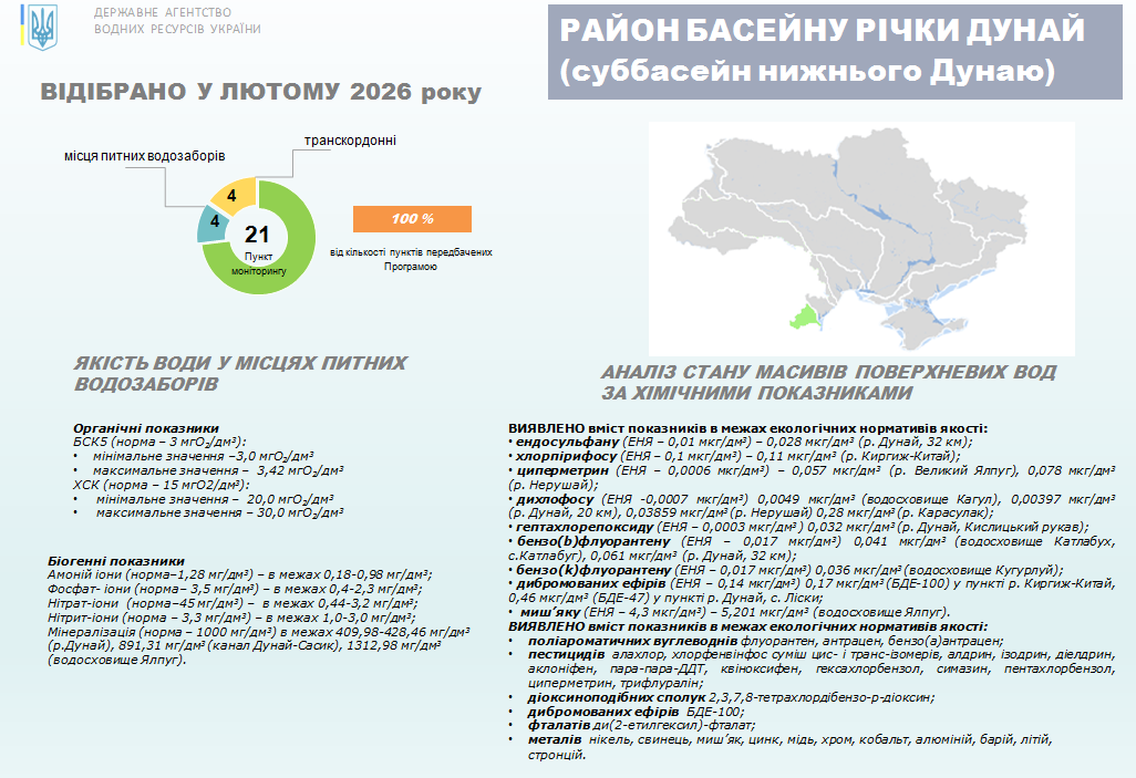 У лютому 2026 року лабораторією моніторингу вод Південного регіону БУВР річок Причорномор’я та нижнього Дунаю за Програмою державного моніторингу вод, яка затверджена наказом Мінекономіки від 27.01.2026